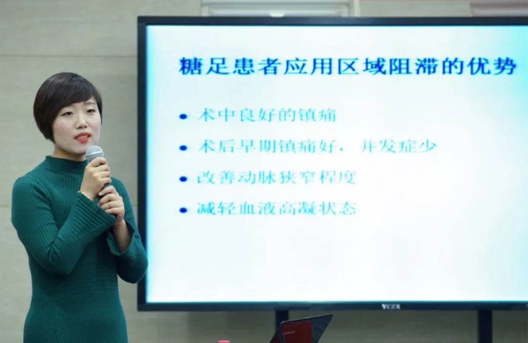 在病例分享环节,主讲人是我院麻醉科的年轻医师刘冠锦。她选取了我院比较有特色的糖尿病足清创截趾手术的麻醉。我院糖足患者数量众多,从前我们只能以局麻醉辅助静脉麻醉的方式来处理,很难达到理想的麻醉效果。现如今我们能够借助超声、神经刺激仪的帮助,精确定位神经,大大提升了患者的舒适度。刘冠锦大夫在此病例中采用了收肌管注射加前路坐骨神经阻滞的麻醉方式,其优点是可以在平卧位完成穿刺操作,避免翻动病人。但是这种方法有一定难度,我们也尚在摸索之中。马浩南主任启发大家就此病例展开讨论,大家也在此氛围下畅所欲言,各抒己见。