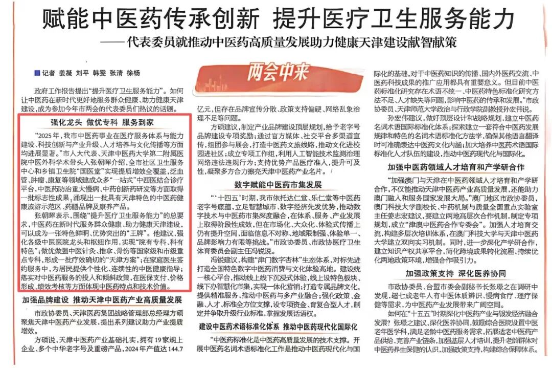“2025年,我市中医药事业在医疗服务体系与能力建设、科技创新与产业升级、人才培养与文化传播等方面均进展显著。”市人大代表、天津中医药大学第二附属医院中医外科学术带头人张朝晖介绍,全市社区卫生服务中心和乡镇卫生院“国医堂”实现提质增效全覆盖,泛血管、肿瘤、康复等领域建成众多“一站式”中西医结合诊疗平台,中医药防治重大慢病、中药创新药研发等方面取得一批标志性成果,涌现出一批具有天津特色的中医药健康旅游示范区、药膳品牌及康养产品。